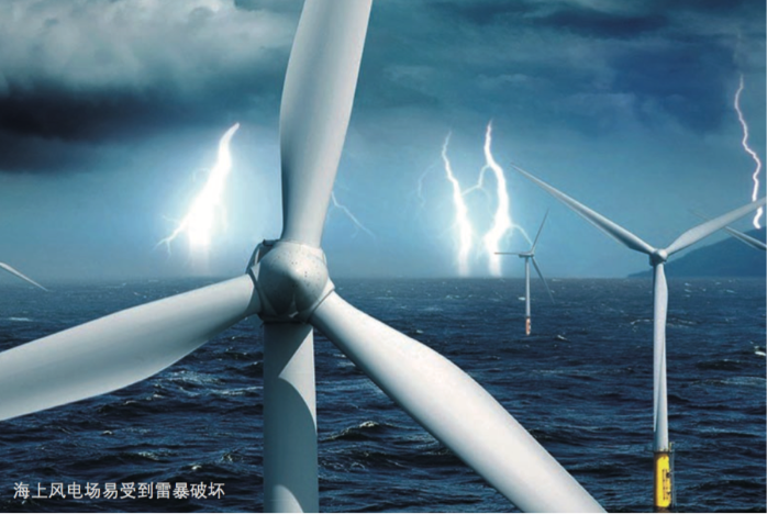 近海地区强对流天气多发、空气湿润,容易形成雷暴。海上风力机矗立在平坦的海面上,同时水气和盐雾又会在叶片表面聚集,使得风力机易于遭到雷电袭击。最可能被雷击损害的部件是位于风力机最高点的叶片;风力机内部控制系统被雷电流干扰,会导致风力机不能动作或做出错误动作;雷电流还会在机舱内部金属间隙产生火花,引起火灾和爆炸。