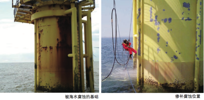 避免腐蚀的另一种常用方法是在钢结构表面施以由环氧树脂构成的防腐涂层来隔绝海水。目前,海上风电的防腐常将这两种方法结合起来,在涂料中加入大量锌粉或铝粉,成为牺牲阳极。一旦涂层的阻隔作用削弱,就用牺牲阳极来保护。