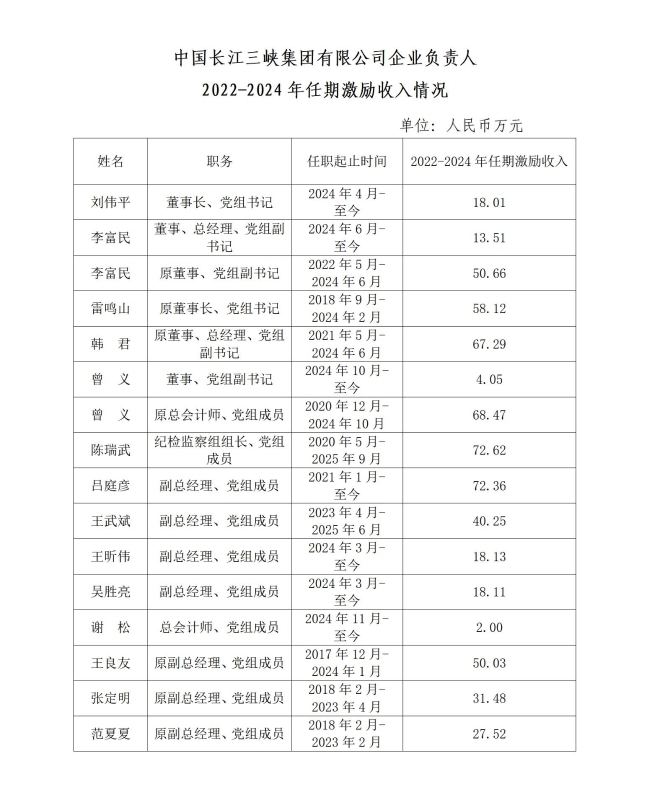 中国长江三峡集团有限公司企业负责人2022-2024年任期激励收入情况