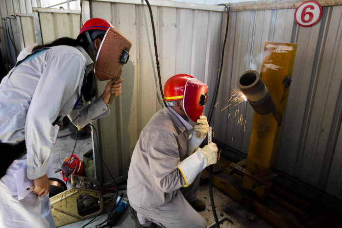 7月18日,在简短的启动仪式后,活动正式进入实际操作的比拼。率先登场的是电焊工,记者在位于白鹤滩压力钢管厂的比武现场看到,参赛选手们头戴防护罩,手持电焊