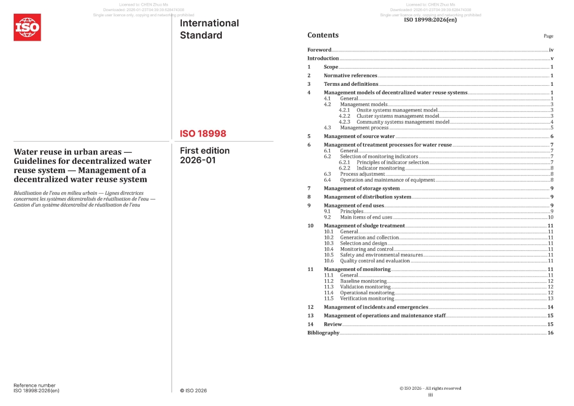 图为ISO国际标准《城镇水回用——分散式水回用系统指南——分散式水回用系统管理》的封面及目录