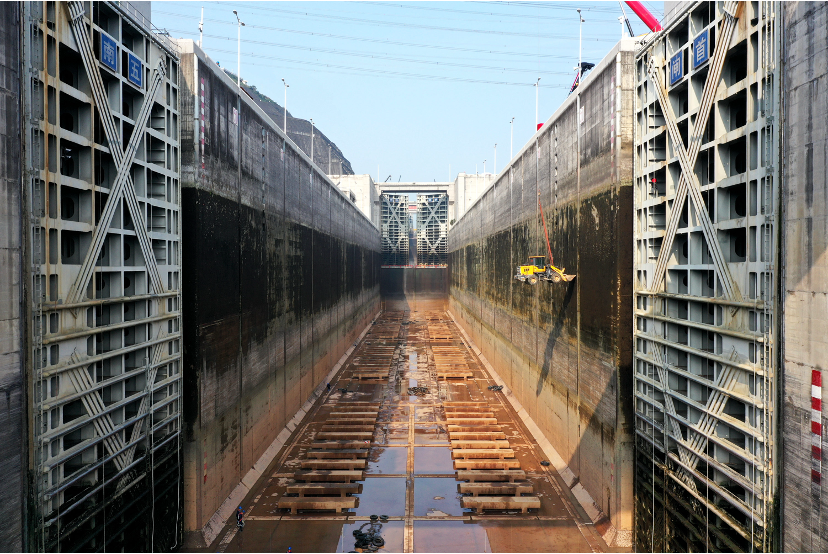▲三峡南线船闸闸室内的水已被排干